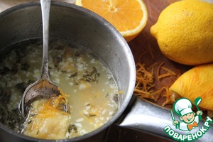 • Вмешать сок лимона и апельсина, цедру, мед, соль.