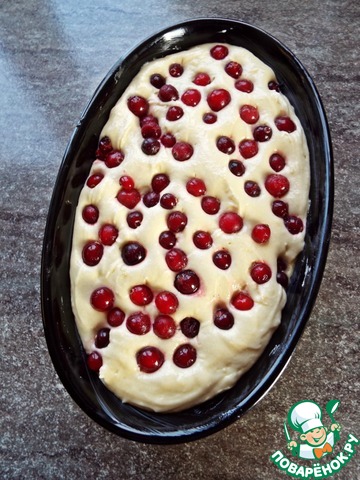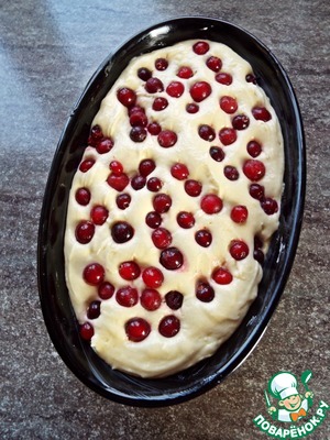 Выложиить оставшееся тесто, разровнять. Разложить клюкву.