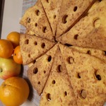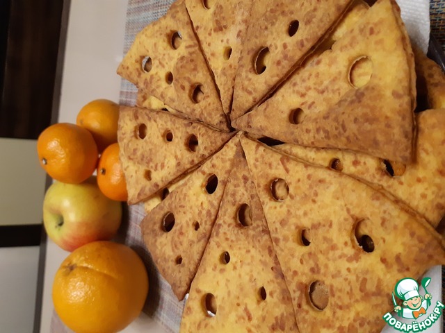 Каждую часть раскатать на припыленной мукой поверхности в круг диаметром 20-21 см (толщина теста где-то 3-4 мм). Разрезать на 8 секторов, сделать дырочки при помощи трубочек для коктейля и штуки, которой вырезают сердцевину у яблок ( не знаю как она называется), или другими приспособами, которые есть у Вас дома.