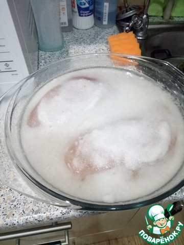 Спустя 24 часа, достаем наше мяско - оно уже пустило сок и при этом потеряло грамм 300 в весе