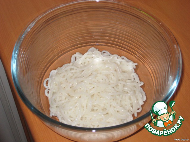 • Рисовую лапшу отварить в воде (не солить!) в течение 10 минут. Откинуть на дуршлаг и промыть.