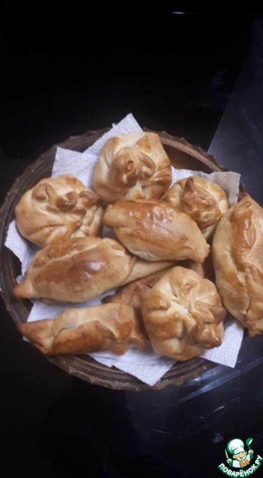 • Затем края пирожочков аккуратно "собираем". Выкладываем наши заготовки на противень, застеленный пергаментной бумагой. По желанию, можно смазать их, смешав один желток и столовую ложку молока, так они получатся более румяными.
