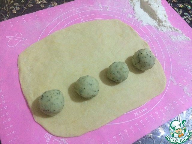 Берём один кусочек теста, раскатываем в прямоугольник и выкладываем с одного края 4 шарика из картофеля.