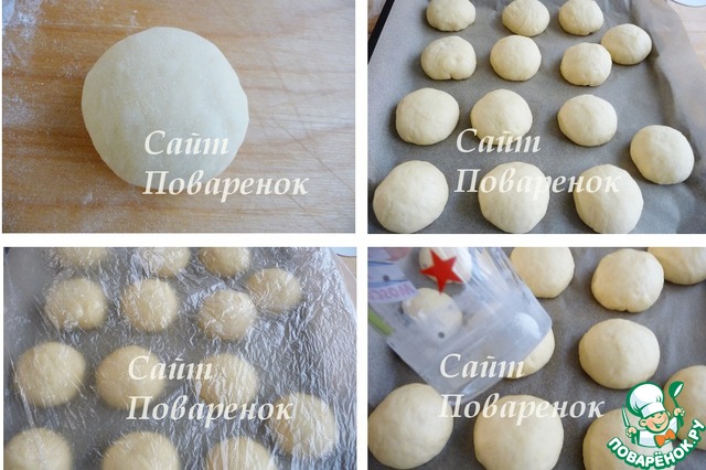 Заготовки перевернуть швом вниз, прокрутить на рабочей поверхности без муки под рукой против часовой стрелки, чтобы получился гладкий шарик. Выложить на противень, застеленный пекарской бумагой.