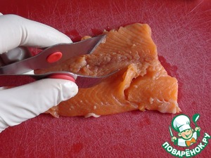 Рыбу вымыть, удалить кости, срезать кожу и т. п. Лично я вынимаю косточки пинцетом.