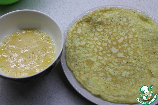 Каждое яйцо взбить венчиком или вилкой, посолить, добавить чёрный молотый перец и испечь два блинчика. Дать им остыть.