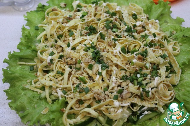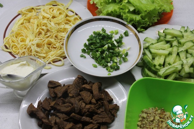 Говядину нарезать небольшими брусочками, обжарить на сковороде до готовности и мягкости, подливая в процессе готовки воду. В майонез добавить измельчённый чеснок, перемешать. Листья салата помыть, лук нарезать, огурцы - соломкой, блинчики кольцами, грецкие орехи измельчить.