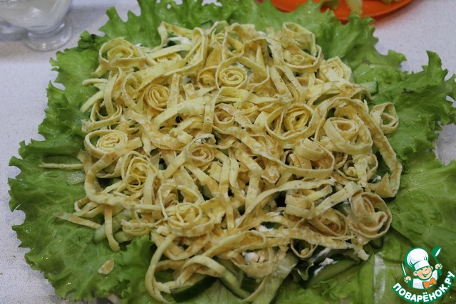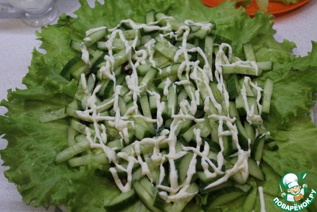 Потом нарезанные огурцы и сделать тоненькую сеточку из майонеза.