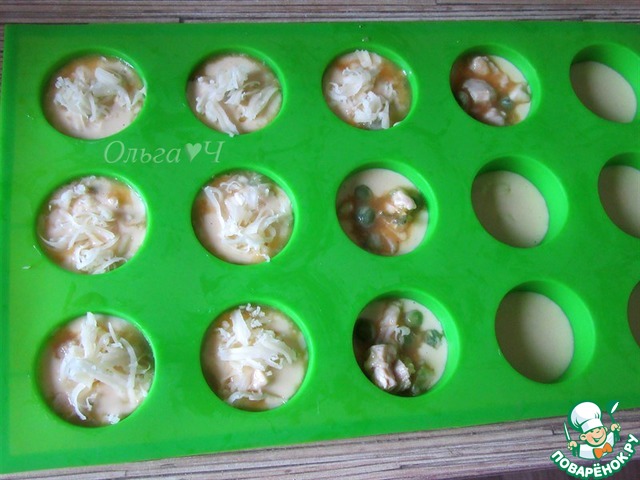 В маленькие формочки, смазанные маслом, выложить немного жидкого теста, затем начинку и залить оставшимся тестом. Посыпать сверху оставшимся сыром. Получается примерно 20-22 штучки. |