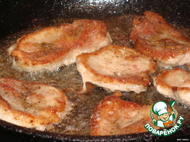 По прошествии 2 часов берем мяско, обмакиваем его в муку и обжариваем на большом огне на сковороде. К сожалению дальше фотографировать не получилось, разрядился фотик. Потом нарезаем лук полукольцами, но тоненько. Берем казанок и складываем слоями: лук, грибы, мясо и т. д. Добавляем немного воды, примерно стаканчик и тушим минут 15. Потом поливаем сверху сметаной и еще тушим минут 10-15. И все, можно наслаждаться.