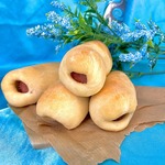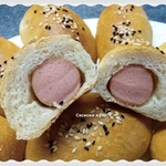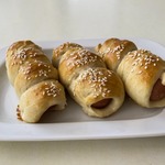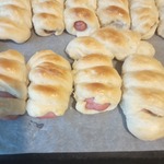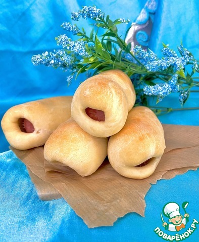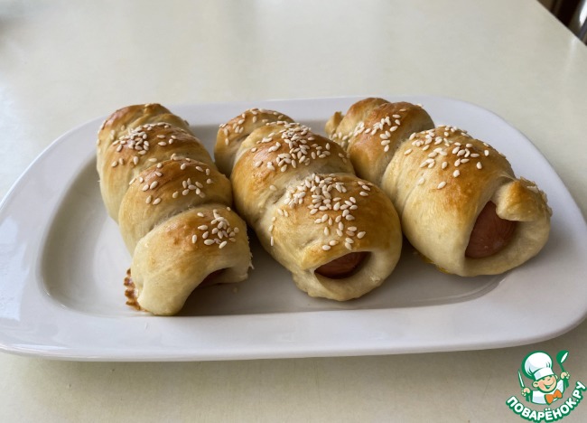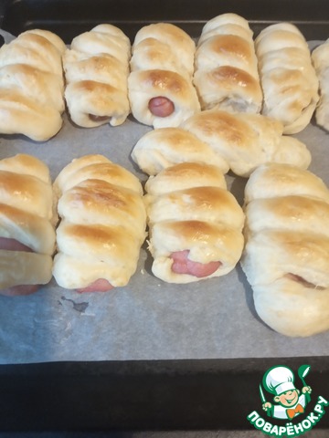 5. Затем разрезаем тесто и начинаем раскатывать его для заворачивания сосисок