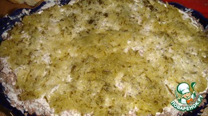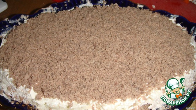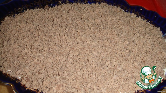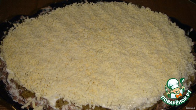 3 слой мясо натрите на тёрке или измельчите,это будет следующий слой и тоже обмазать майонезом