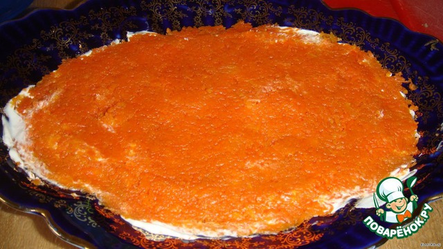 2слой поверх картошки, морковь натрите на мелкой тёрке и намажьте майонезом