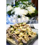 Украсить тёртым мясом,готовый салат положите в холодильник на 2 часа(для пропитки)