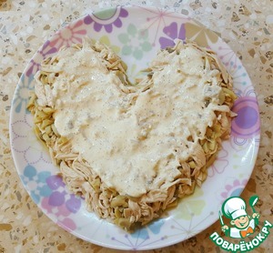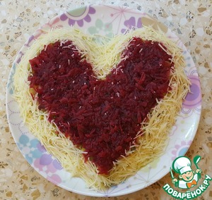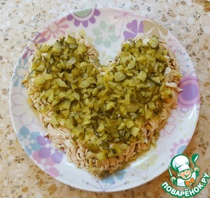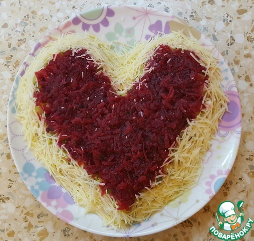 Хороший, не сложный салат. Еще он хорош тем что его можно сформировать в любую фигуру в зависимости от праздника: сердце, круг, треугольник, квадрат, восклицательный знак, вопросительный знак, ёлочку, крест, звезду, круг с отверстием под свечу и т. д.