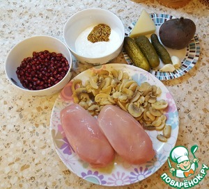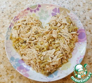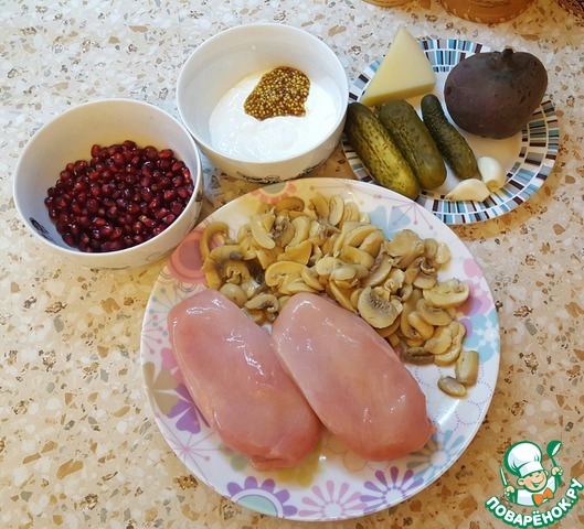 Филе и свеклу отварить. Шампиньоны и огурцы мелко нарезать. Филе остудить, разорвать на волокна, смешать с грибами и сформировать на тарелке в форме сердца. -