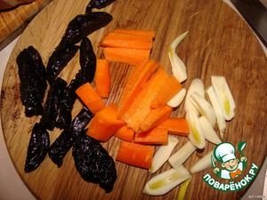 Нарезаем морковку, чернослив и чеснок полосочками.
