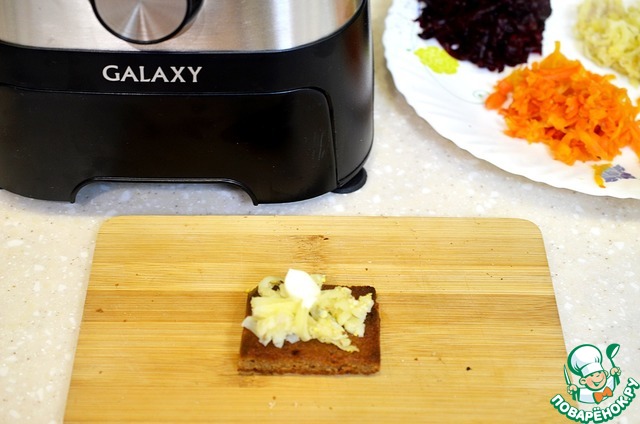 На каждую гренку выложите немного тертого картофеля и капельку майонеза.
