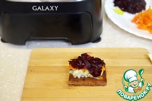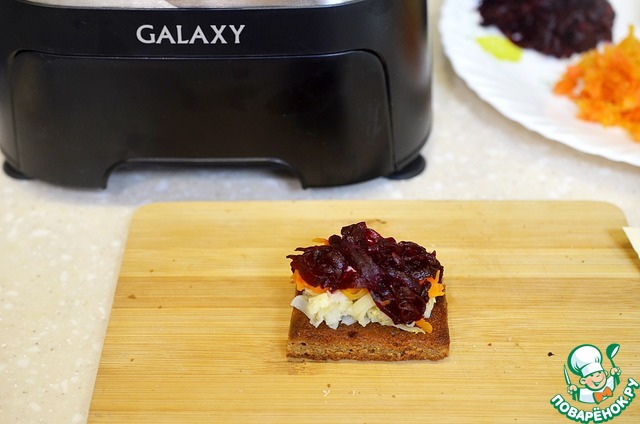 Затем морковь и капельку майонеза и сверху свеклу и капельку майонеза.