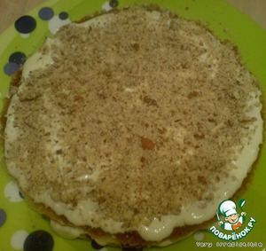 Кладем сверху снова медовый корж, пропитываем соком, смазываем кремом и посыпаем измельченным миндалем.