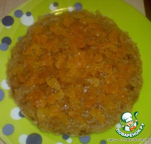 Медовый корж пропитываем апельсиновым соком, кладем на него измельченную курагу и смазываем кремом. -