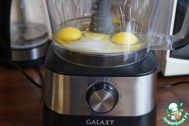 Начнем с приготовления теста. Яйца при помощи комбайна взобьем с сахаром и солью в пышную массу.