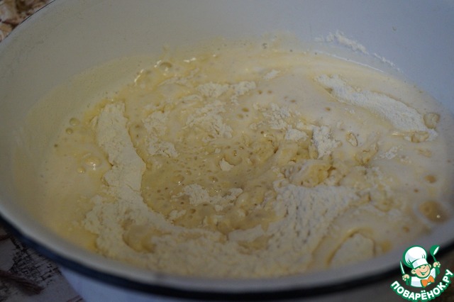 Замесим не очень крутое тесто. Накроем тесто салфеткой и оставим для подъема в теплом месте на 1,5 часа.