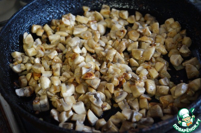 Нарежем лук кубиками и обжарим его на растительном масле, затем добавим нарезанные кубиками шампиньоны. Еще немного поджарим и добавим мясо курицы. Посолим и поперчим по вкусу. Отставим, чтобы остыло.