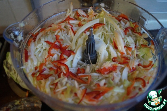 Капусту при помощи комбайна измельчим соломкой вместе с морковью и болгарским перцем.
