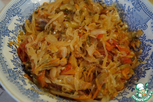 Потушим капусту с овощами и томатной пастой. Остудим. Смешаем капусту с курицей и грибами.