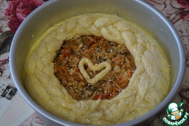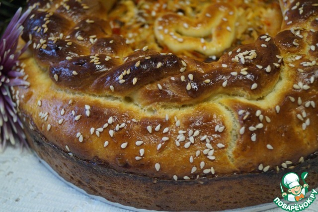 Готовый к выпечке пирог смажем желтком и посыпим кунжутом. Выпекать будем пирог при температуре 180 градусов 20-30 минут. Пирогу даём остыть, выкладываем на блюдо и подаем к столу. Особенно хорош пирог в теплом виде.