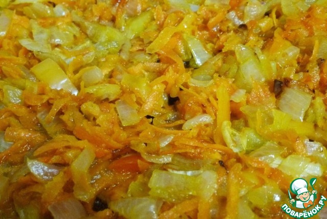 Лук мелко нарезать, а морковь натереть на крупной терке. Обжарить всё вместе до золотистого цвета. Охладить.