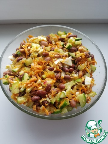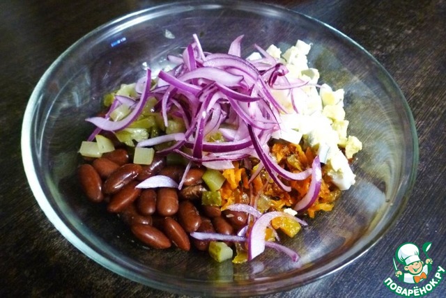 В салатник выложить вареную фасоль. Добавить обжаренные овощи.