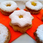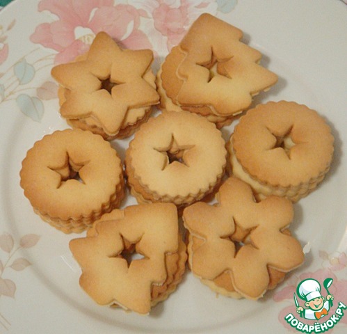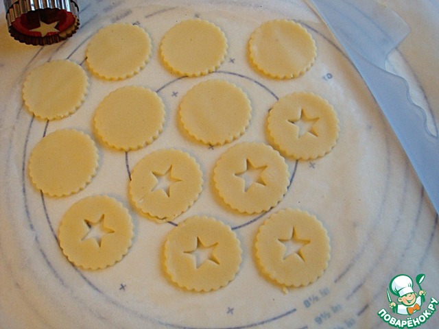Тесто раскатать скалкой в пласт толщиной 3 мм. Вырезать печенье любой формы. В половине из них сделать отверстие в центре.