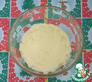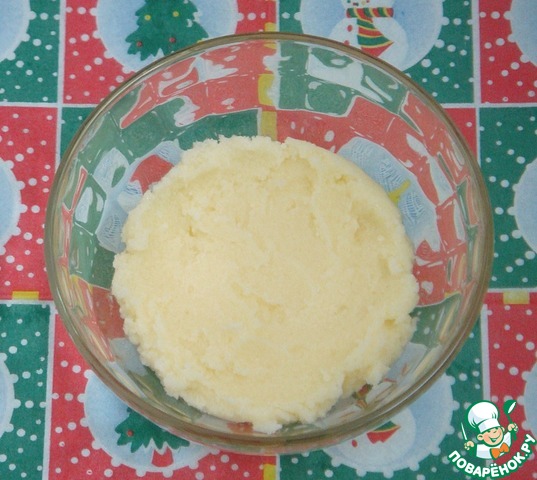 Масло нарезать кубиками и ложкой растереть с сахарным песком и ванильным сахаром.