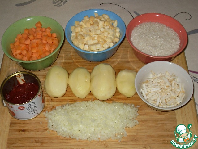 Подготовить продукты. Овощи вымыть, очистить и нарезать: морковь и репу - маленькими кубиками, картофель - кубиками покрупнее. Лук измельчить произвольно. Рис тщательно промыть. Я еще от себя добавила немного корня сельдерея, не могу без него. Но это единстввенное отступление от рецепта Адибы.