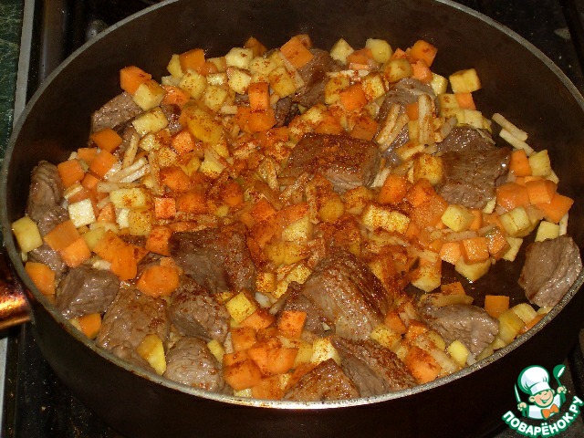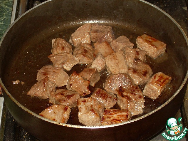 Мясо обмыть, обсушить и нарезать довольно крупными кусочками. Обжарить до румяной корочки, добавить мелко нарезанный лук и красный перец, жарить все вместе несколько минут -