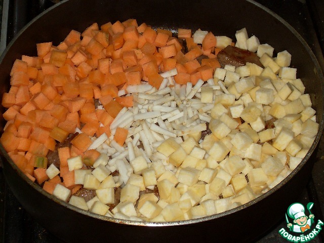 Всыпать морковь и репу (у меня еще и сельдерей), обжарить до полуготовности овощей.