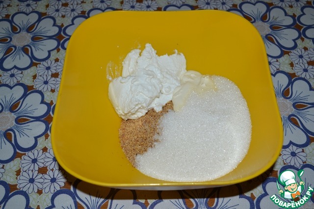 Крошку высыпать в глубокую чашу, добавить сыр Рикотта, сметану и сахар.