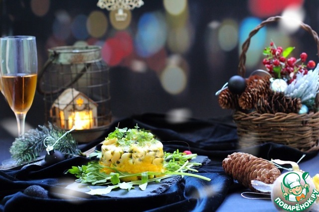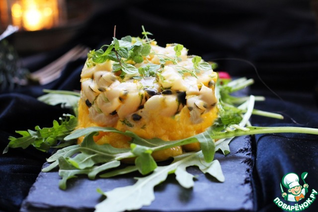 С помощью кулинарного кольца выложить в тарелку для подача сначала слой манго, затем слой гребешка. Слои хорошо прижать и снять кольцо.