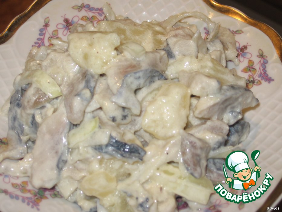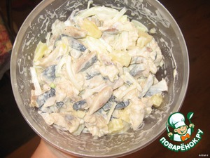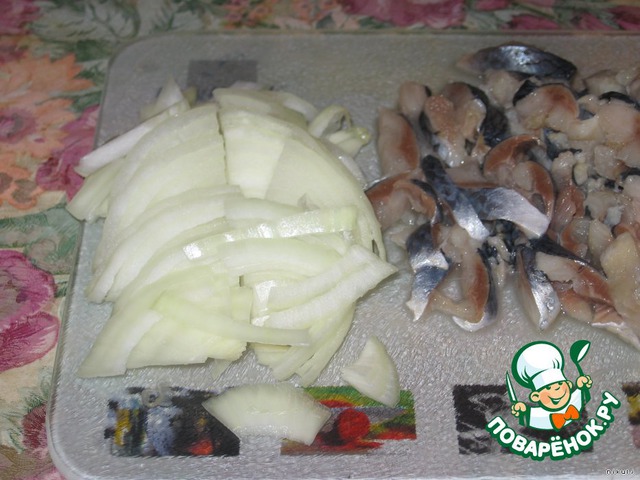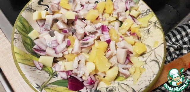 Сельдь очищаем от костей и внутренностей, режем тонкими полосочками длинными, отдельно нарезать ананас маленькими кубиками, лук полукольцами.