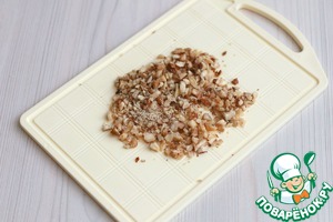 Грецкие орехи (2 горстки) промыть, подсушить в духовке, затем нарезать не крупными кусочками.