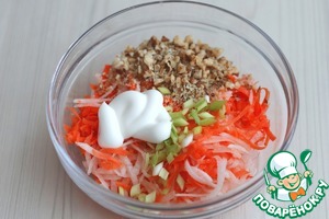 Соединить в миске все составляющие салата, добавить нарезанный зеленый лук, добавить соль по вкусу. Заправить салат майонезом.