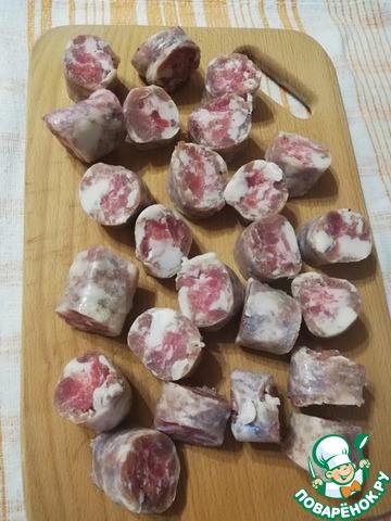 У меня домашняя колбаса. Если нет колбасы можно заменить свининой. Колбасу также нарезать не тонкими кружочками.