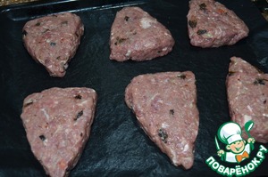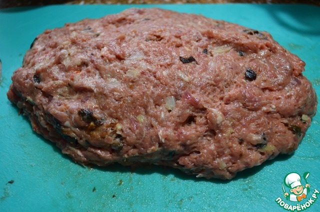 Чернослив и сушёные помидоры-черри нарезать и добавить к мясу. -