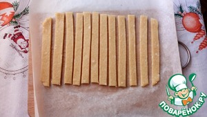 Охлажденные полоски на пергаменте выложите на противень и выпекайте 12-15 мин. в разогретой до 170°С духовке. Готовые палочки достаньте из духовки и дайте им остыть. -