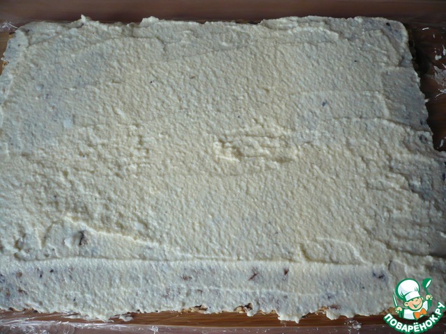 Теперь точно также, следует повторить со вторым слоем торта: слой крема ( оставьте немного крема для того, чтобы обмазать края торта, я положила его в кулинарный мешок и поставила в холодильник), форель, лук, укроп. И снова выложите слой печенья - это будет последний слой. Печенье хорошо придавите. Верх торта кремом смазывать не нужно. Заверните торт в пищевую пленку и поставьте на ночь в холодильник, чтобы он хорошо пропитался.