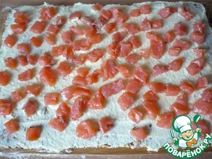 Сверху крема распределите 1/2 часть нарезанной форели.