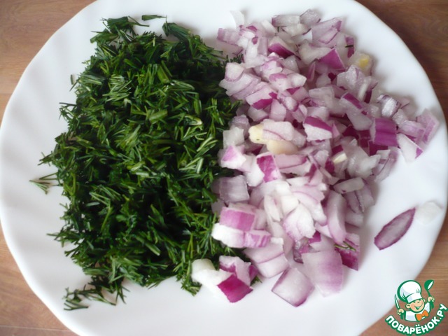 Нарежьте красный лук мелкими кубиками, а также мелко нарежьте укроп.