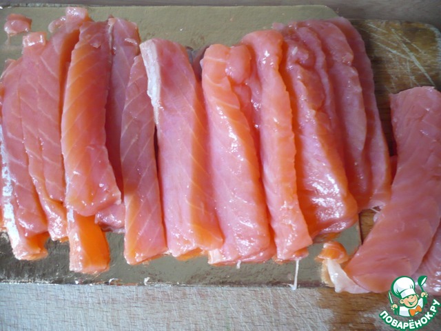 Слабосоленую форель нарежьте ломтиками, срезая мясо с кожи (если она есть).